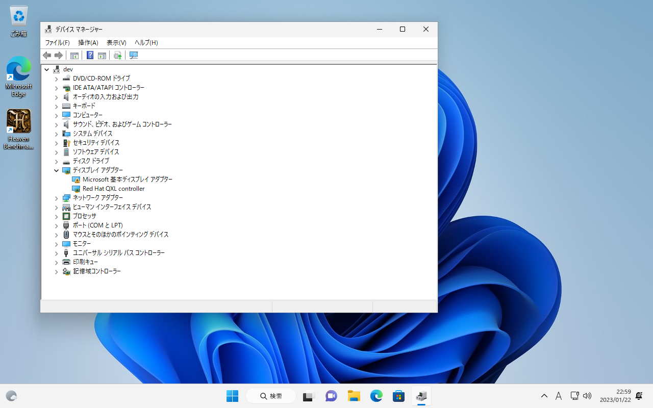 OSのインストールが終わったら virtio windows driver を使い、デバイスマネージャーで警告の出ているデバイスにドライバを当てておく。この時点ではディスプレイアダプターとしては Redhat QXL controller のみが表示されている。